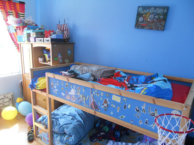 Above all else, furniture in a boy's bedroom should be sturdy and hardwearing - where possible it should also perform a dual purpose. Cabin beds (or captain beds), that have built in storage underneath the bed, or even a desk, is especially good in a boys room, as are storage units that have seating on top. Large wooden furniture with a natural finish, or completed in a primary color, or one that complements the room's decor also works well. Metal furniture, such as bookshelves, adds some authenticity especially to a space themed room, but you should obviously take care of rough edges around small children.
